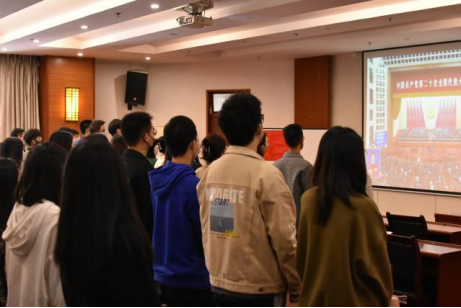 研综楼学术报告厅充满了庄严而神圣的氛围,部分同学早早来到会场,齐聚一堂观看中国共产党第二十次全国代表大会开幕会的直播。