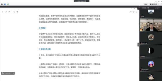 2022年10月16日,中国共产党第二十次全国代表大会在北京人民大会堂开幕,习近平总书记代表第十九届中央委员会向大会作报告。威廉希尔中国官网组织全体师生通过电视、手机、网络直播等方式收看了开幕会,并全程认真聆听了党的二十大报告。为了进一步加深对二十大报告内涵的理解,我院研究生第三党支部通过腾讯会议组织学习了党的二十大精神。