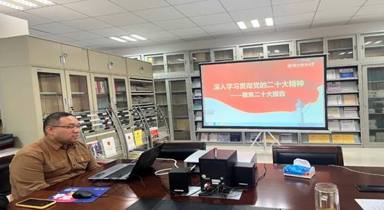 团省委青年讲师团成员、公司青年教师步洋洋副教授以《深入学习贯彻党的二十大精神-----聚焦二十大报告》为题,从二十大报告主要内容,全面依法治国、推进法治中国建设,坚定不移全面从严治党,青年兴则国家兴等四个方面分享了学习党的二十大精神的心得体会。