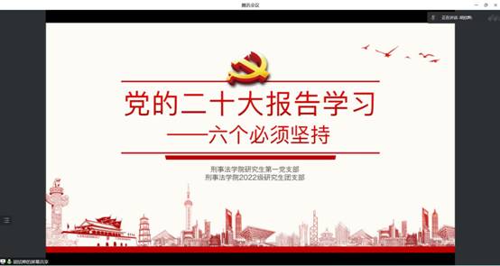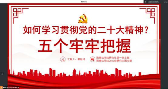 中国共产党第二十次全国代表大会是在全党全国各族人民迈上全面建设社会主义现代化国家新征程、向第二个百年奋斗目标进军的关键时刻召开的一次十分重要的大会。2022年11月4日上午,为深入学习领悟党的二十大精神,团结凝聚青春奋斗力量,威廉希尔中国官网研究生第一党支部、威廉希尔中国官网2022级研究生团支部联合举行党的二十大精神专题学习会议。会议由支部书记霍世琦主持。