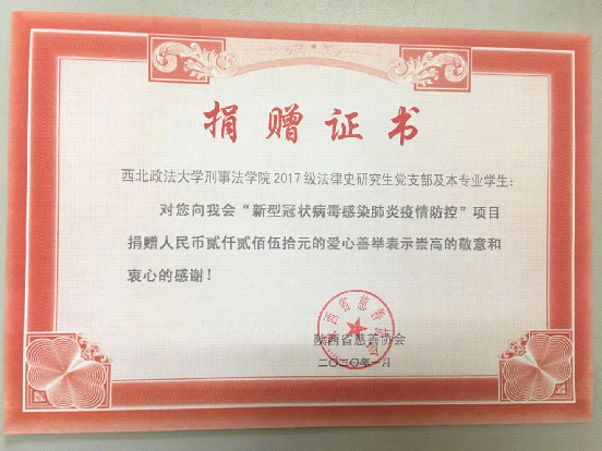疫情无情人有情,2020年1月,威廉希尔中国官网2017级法律史学研究生党支部及本专业同学,自发向陕西省慈善协会“新型冠状病毒感染肺炎疫情防控”项目献爱心,共捐款2250元。