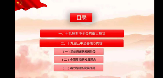 学习内容包括十九届五中全会的重大意义和核心内容两大部分。 孙婧钰同学首先介绍了十九届五中全会的重大意义。从时间上看,党的十九届五中全会是在“两个一百年”历史交汇点上召开的一次十分重要的会议,更是一次具有全局性、历史性意义的重要会议;其次,孙同学从宏观上介绍了全会审议通过的《中共中央关于制定国民经济和社会发展第十四个五年规划和二〇三五年远景目标的建议》并详细介绍了《建议》是推进全面建设社会主义现代化国家的行动指南。