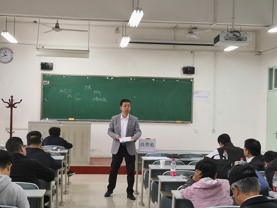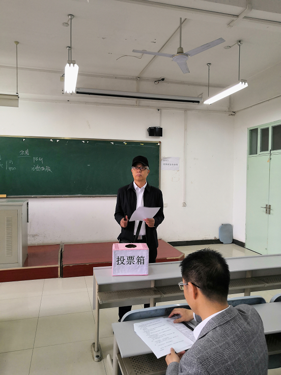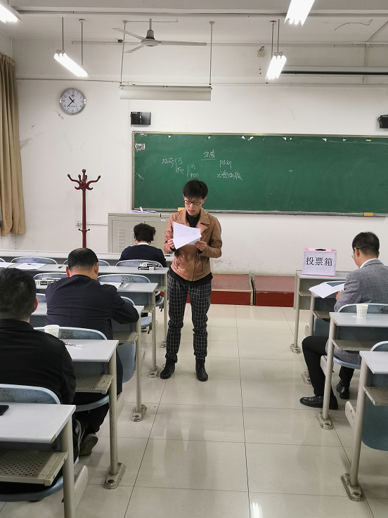 大会通过公司刑法学教研室杜发全老师为总监票人,谭堃老师和罗长征老师为监票人,薛晖老师和李锟老师为计票人。总监票人杜发全老师主持了选举大会,清点到会人数、检查投票箱、安排李子榛老师宣读工会委员候选人个人介绍,并组织监票人清点选票、统计选票和报告计票结果。