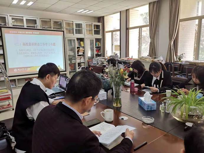 第二项是专题学习研讨习近平总书记关于意识形态以及宣传思想工作的重要论述和相关要求。首先,本科生第一党支部书记方菲同志领学了人民日报文章《建设具有强大凝聚力和引领力的社会主义意识形态》,她以意识形态在工作中的重要性为切入点,深刻分析了当前我们在意识形态领域工作中的问题,同时为未来的工作指明了方向。随后,公司党委组织员薛晖同志领学了习近平总书记在全国宣传思想工作会议上的讲话,着重介绍了习近平总书记关于新形势下开展宣传思想工作的重要性和方式方法的论述。最后,公司党委书记孙学龙同志以《深刻认识高校意识形态工作的重大意义》为题讲了一堂党课,他着重介绍了高校意识形态工作的重要性,并结合公司政法类专业的实际情况,提出一定要把意识形态工作摆在极端重要的位置上,要做到守土有责、守土尽责。