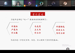 2021年7月28日上午,威廉希尔中国官网研究生第二党支部组织全体党员和入党积极分子学习习近平总书记在庆祝中国共产党成立一百周年大会上的讲话精神,本次会议在腾讯会议平台进行。由尚靖同志(纪检委员)作为主讲人带领大家共同学习“七一讲话”内容。尚婧同志通过三个模块,即总录、分录、结束语三个模块为大家讲解与共同学习。总录包括“实现了一个目标”、“明确了一个主题”等内容,分录包括“四个伟大成就”、“四个庄严宣告”、“伟大建党精神”、“九个必须”等内容,最后以“一个伟大号召”、“发出时代最强音”作为结束语。
