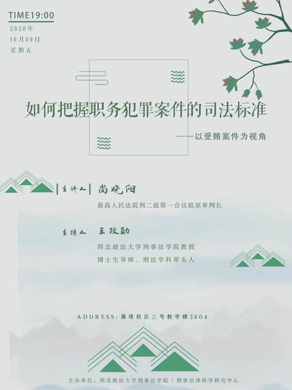2020年10月9日,williamhill官网刑法学科本学年的第一场线下实务讲座活动在williamhill官网雁塔校区三号教学楼3604教室举行。本次讲座由威廉希尔中国官网、刑事法律科学研究中心主办,由最高人民法院刑二庭第一合议庭原审判长尚晓阳法官担任主讲人。陕西省高级人民法院刑二庭王海峰法官、williamhill官网刑法专业硕士生导师组组长杜发全教授、刑法教研室主任张国伟副教授、刑法教研室杨磊副教授、谭堃副教授、赵姗姗博士、刑事诉讼法学教研室罗长征老师刑法学专业研究生参与了本次讲座。