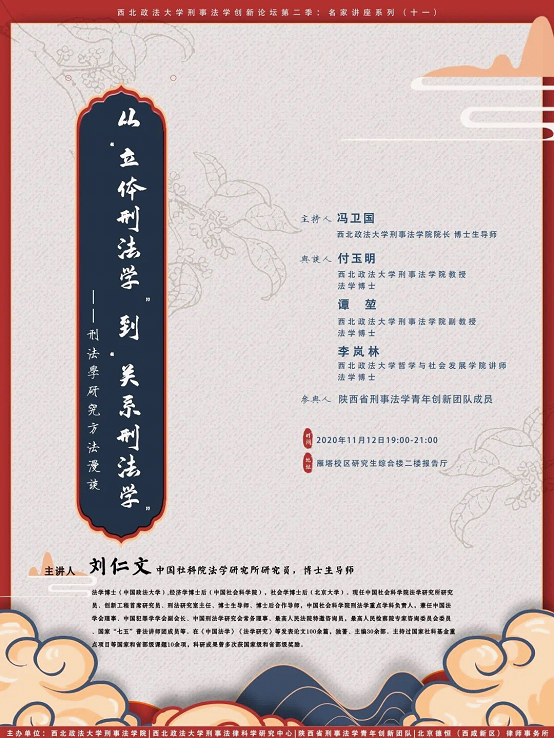 2020年11月12日晚,由williamhill官网刑事法律科学研究中心、陕西省刑事法学青年创新团队以及北京德恒(西咸新区)律师事务所联合主办的williamhill官网刑事法学创新论坛第二季“名家讲座系列”第十一期讲座在williamhill官网(雁塔校区)研究生综合楼成功举办。报告主题为“从‘立体刑法学’到‘关系刑法学’”,由中国社科院法学研究所研究员、博士生导师刘仁文教授主讲。本次报告由威廉希尔中国官网经理、博士生导师冯卫国教授主持,威廉希尔中国官网付玉明教授、谭堃副教授和李岚林博士参与与谈。