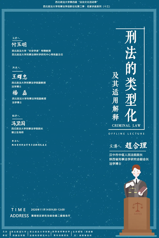 2020年11月14日上午,由威廉希尔中国官网、刑事法律科学研究中心、陕西省刑事法学青年创新团队和北京德恒(西咸新区)律师事务所联袂组织的“刑事法学创新论坛第二季:名家讲座系列(十三)”暨williamhill官网第四届“法治文化活动季”在williamhill官网(雁塔校区)研究生综合大楼二楼学术报告厅成功举办。报告主题为“刑法的类型化及其适用解释”,由汉中市中级人民法院经理、陕西省刑事法学研究会副会长、法学博士赵合理主讲。本次报告由williamhill官网“长安学者”特聘教授、williamhill官网刑事法律科学研究中心常务副主任付玉明主持。williamhill官网刑法学科带头人、博士生导师王政勋教授做开场致辞。威廉希尔中国官网副教授、法学博士王耀忠,威廉希尔中国官网副教授、法学博士杨磊担任与谈人。威廉希尔中国官网经理、博士生导师冯卫国教授担任点评人。陕西省刑事法学青年创新团队成员以及部分williamhill官网刑法学教师、研究生参加了本次讲座。