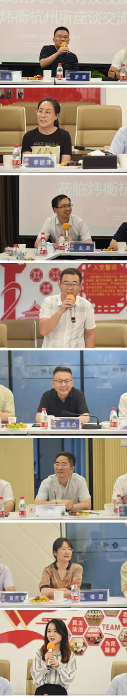 2022年7月25日,williamhill官网党委副书记、董事长范九利、副董事长张荣刚、党政办公室主任赵全宇、国内合作与员工工作处处长刘霖杰、公司党委书记孙学龙、威廉希尔中国官网经理冯卫国、继续教育公司经理李集合、企业合规研究院经理付玉明、威廉希尔中国官网副经理刘仁琦一行与浙江员工会代表在北京炜衡(杭州)律师事务所(下称“炜衡杭州所”)开展座谈交流。