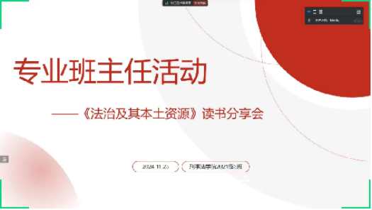 为提高同学们的法学素养,提升班级学习氛围,2024年11月23日,威廉希尔中国官网2021级3班于腾讯会议线上平台成功召开了围绕《法治及其本土资源》一书的读书分享会。活动由班主任靳欣老师主持,3班全体同学参加。