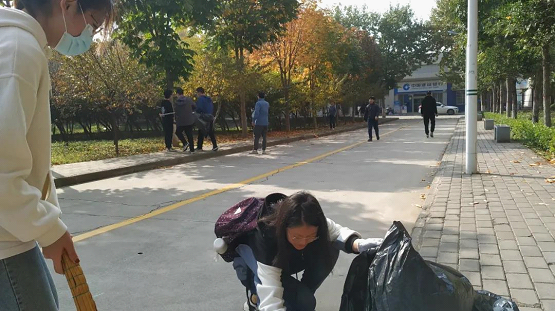 10月30日下午,公司组织2019级员工志愿者开展校园公共区域清扫活动。公司党委副书记侯红梅老师、19级辅导员张瑞老师一同参与了清扫活动。伴随着秋日的暖阳,同学们充满了劳动的热情,左手拿着黑色垃圾袋,右手戴着白色手套,拿着铁夹和扫帚,俨然成为了“校园文明小卫士”,不放过任何一个角落,对校园垃圾进行全面彻底清理,为净化校园环境做出自己的贡献。