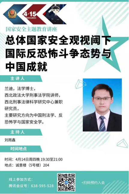 2022年4月15日,第七个全民国家安全教育日到来之际,为深入宣传贯彻习近平总书记关于总体国家安全观和国家安全工作的重要论述,2022年4月14日晚,公司邀请了法律科学中心兼职研究员、法学博士兰迪在智慧教室为公司员工做了题为“总体国家安全观视阈下国际反恐怖斗争态势与中国成就”的国家安全专题讲座。