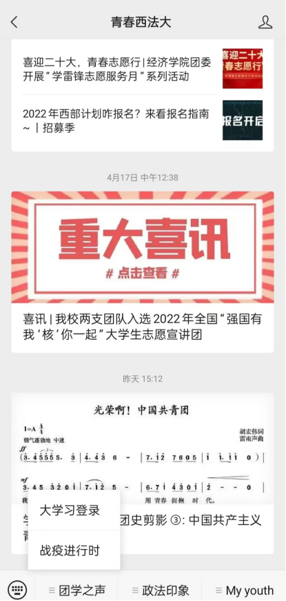 关注青春西法大公众号点击底部菜单栏[团学之声]选择[大学习登录]