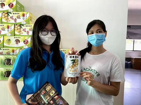 钟经理向团队成员介绍了公司发展的基本情况;带领队员们参观了岭南荔园公司生产的荔枝相关的农副产品、工艺品(“观音绿”荔枝样式的瓷器)等;为队员们讲解了荔枝的深加工流程,带领队员们参观了分拣中心、烘干室等深加工车间;最后介绍了公司分拣荔枝的品控标准和现有的冷藏保存和冷链运输技术。