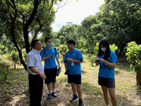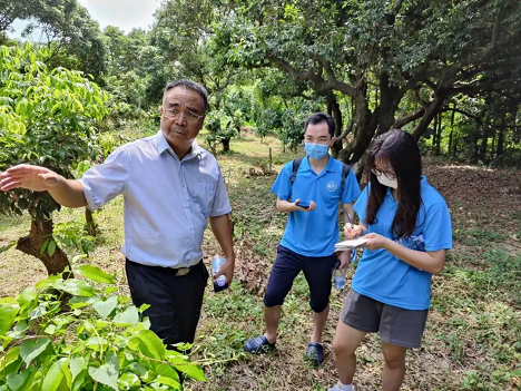 公司副总经理邓展辉带领队员们上山参观了“观音绿”荔枝的古树群,为队员们介绍了荔园的现有规模和未来发展规划,讲解了荔枝种植过程中的一些细节(依托地形优势实现回风授粉、施肥、每棵荔枝树之间保持至少5m的间隙等);同时,指出了目前在收集荔枝的环节存在的问题:荔枝树高大,采摘荔枝的时候果农们很容易从树上或梯子上跌落因而受伤。而如今,企业通过“高接换种”的技术,有效降低了果树高度,使荔枝便于采摘,果农的安全得到了保障;随后带领队员们参观了育苗基地,和队员们介绍了公司的“观音绿”荔枝幼苗储备情况和幼苗移植的相关规划;最后,邓经理和队员们讨论了荔枝产业的现状,指出了目前荔枝的保存和运输方面存在的问题,向队员们介绍了岭南荔园公司相应的解决路径和未来的提升方向,使队员们对于荔枝产业有了更为全面的了解。