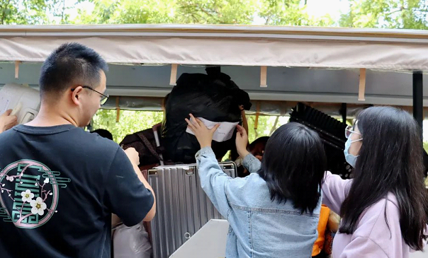 师生志愿者们帮助行李装车、贴条