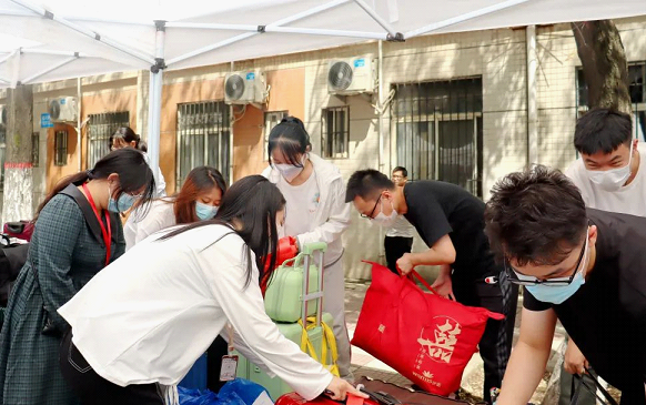 师生志愿者们帮助分发行李