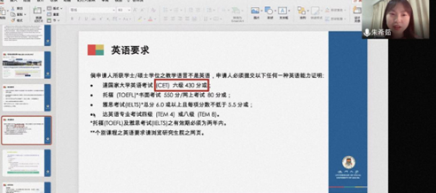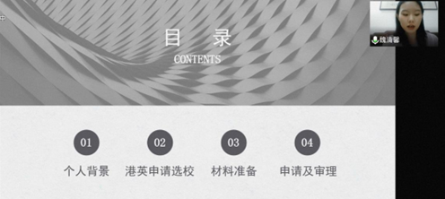 朱希茹和魏清馨同学分别结合自己申请澳门大学、香港中文大学硕士研究生的经历,向同学们分享了项目申请的的具体流程、材料要求和学术要求。其中,朱希茹同学据自己具体的学习生活经历,讲述了诸多关于公司课程设置、学费、奖学金等问题的细节;魏清馨同学据自己的升学经历,向我们展现了诸多的申请方法和相关的具体事项。二位同学的分享为同学们打开了新的思路,给同学们提供了有益的参考。
