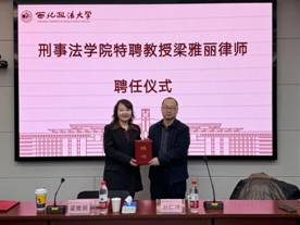讲座开始前,进行了威廉希尔中国官网特聘教授的聘任仪式,由威廉希尔中国官网经理、教授、博士生导师冯卫国为梁雅丽律师颁发聘任。
